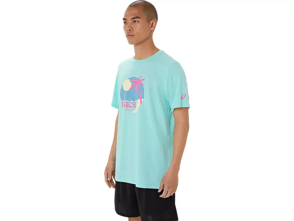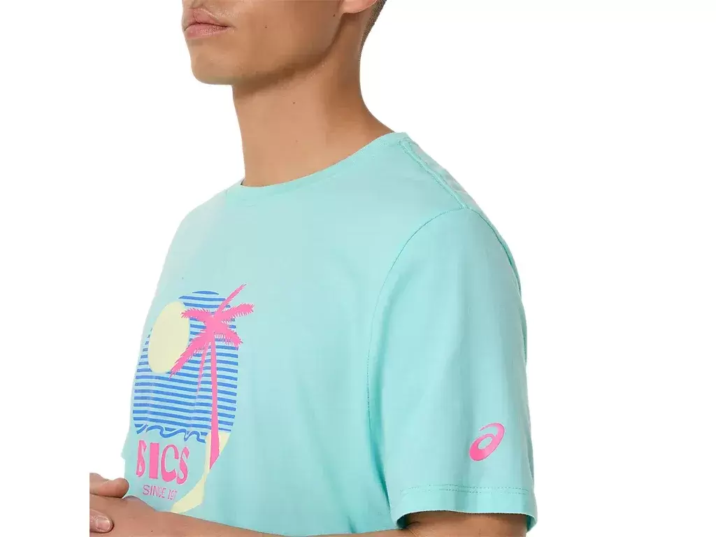 Esta cómoda camiseta de punto de manga corta se inspira en las playas soleadas. El gráfico frontal presenta varios elementos costeros que se complementan con colores vibrantes.