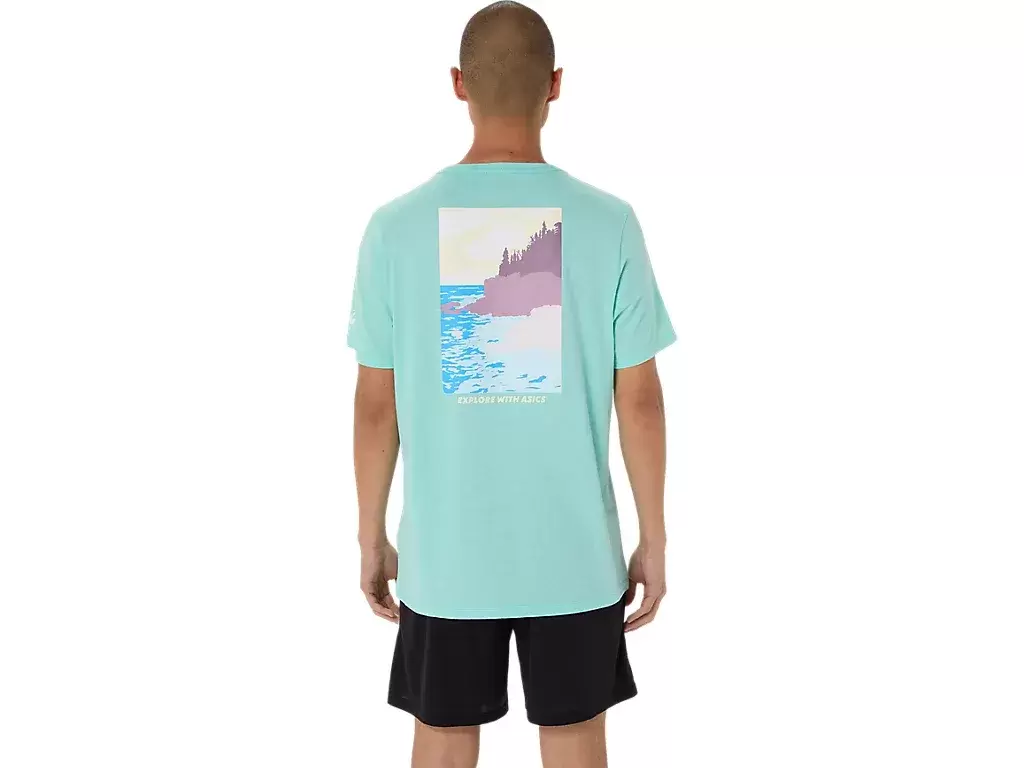 Esta cómoda camiseta de punto de manga corta se inspira en paisajes marinos. El gráfico de la espalda presenta la frase «EXPLORA CON ASICS», complementada con un diseño costero arbolado.