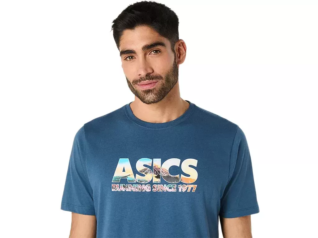 Esta cómoda camiseta de manga corta de punto se inspira en el Monte Fuji. El gráfico frontal presenta la frase «ASICS GLOBAL RUN CLUB», con un estampado de flores de cerezo y picos de montaña.