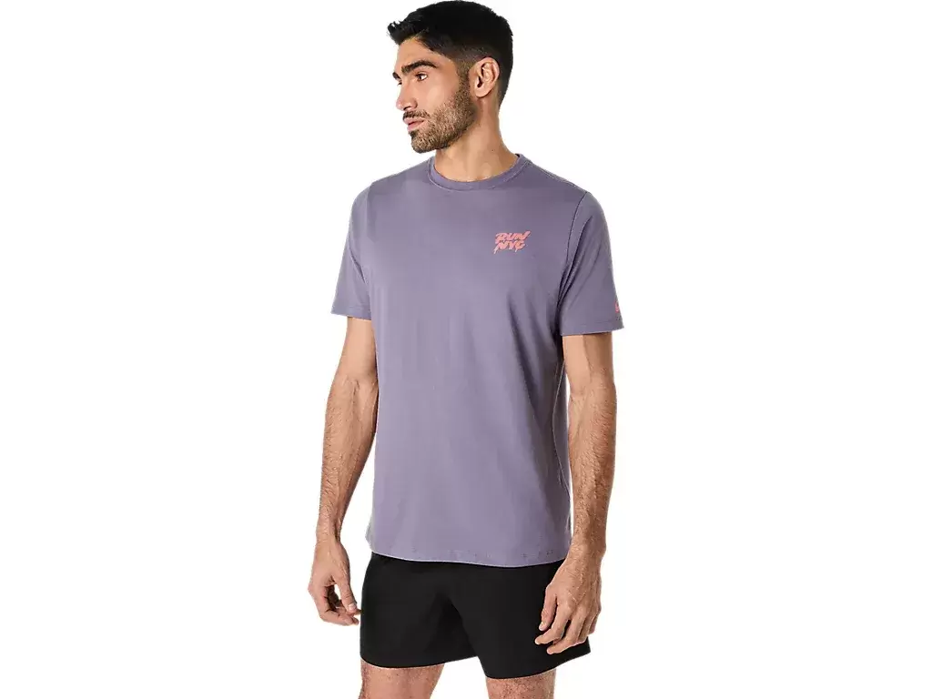 Esta cómoda camiseta de punto de manga corta se inspira en las carreras de Nueva York. La parte delantera lleva la frase «RUN NYC», que se complementa con varios monumentos de Nueva York en la espalda.