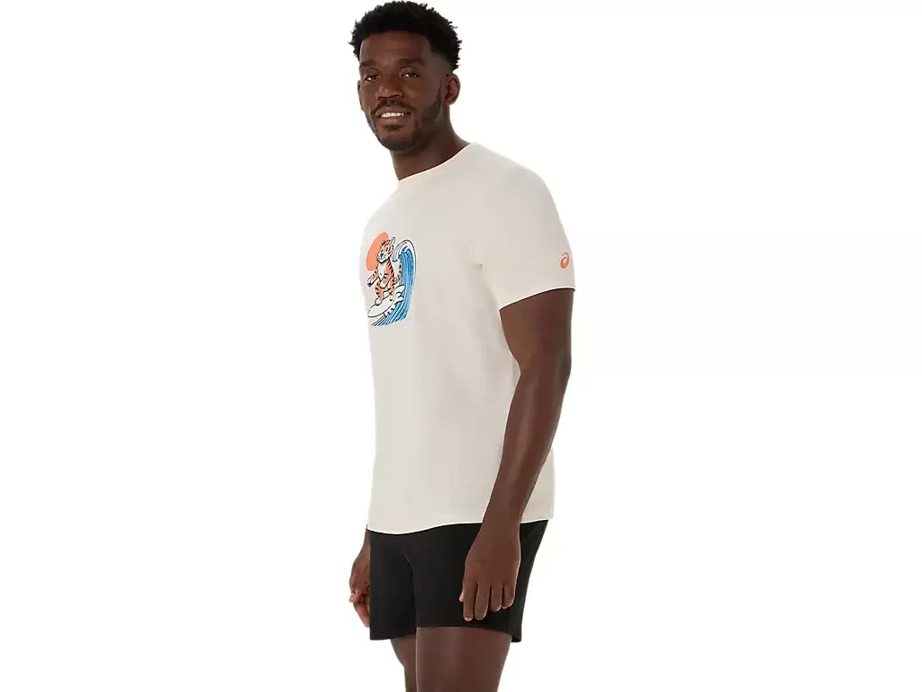 Esta cómoda camiseta de manga corta de punto se inspira en la playa. El gráfico frontal presenta un tigre surfeando, mientras que la frase «SUNSHINE ON MY MIND» aparece debajo.
