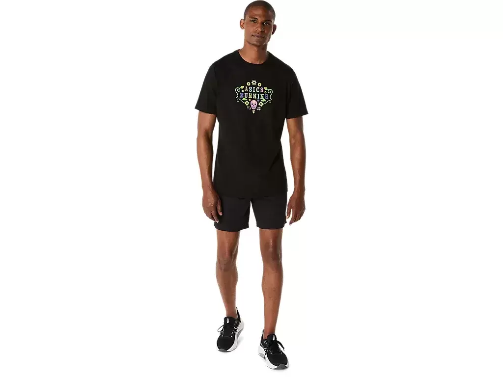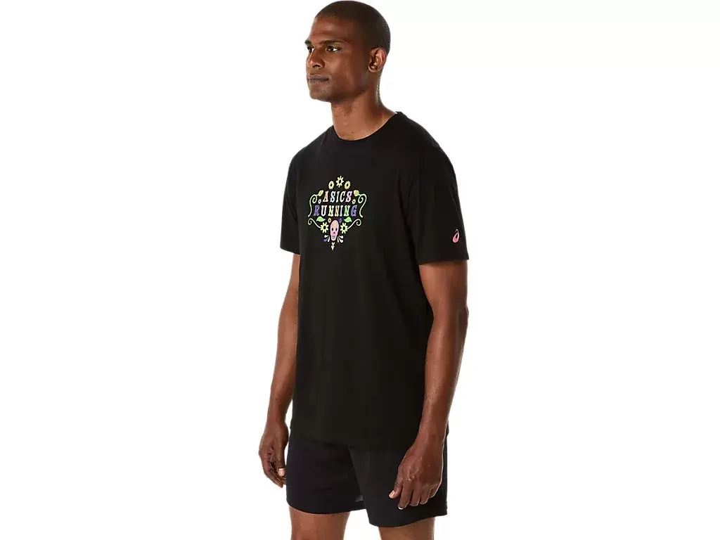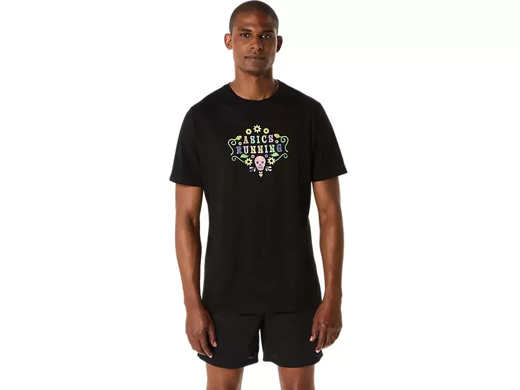 Elegante y cómoda, la camiseta de manga corta DÍA DE MUERTOS es versátil para diversas actividades. La prenda está diseñada con gráficos de calaveras y flores que resaltan la frase «ASICS RUNNING» en el centro. Este estampado también está acentuado con una aplicación que brilla en la oscuridad para un look llamativo en condiciones de poca luz. La camiseta está confeccionada con un suave jersey de mezcla de algodón para mayor comodidad.