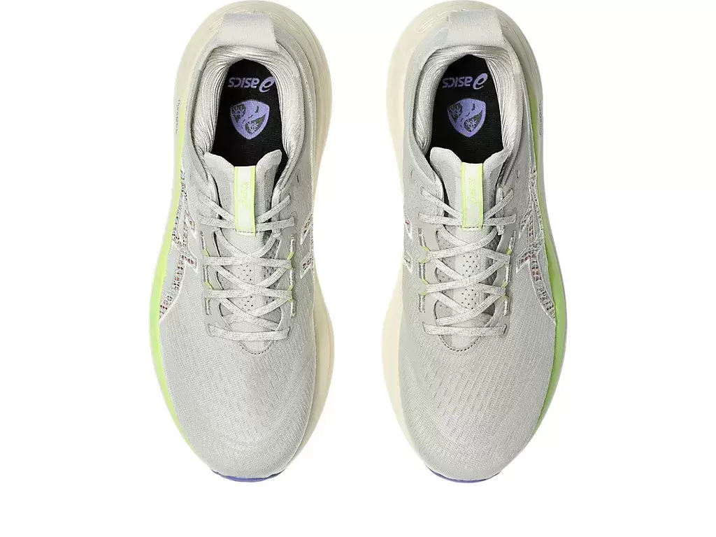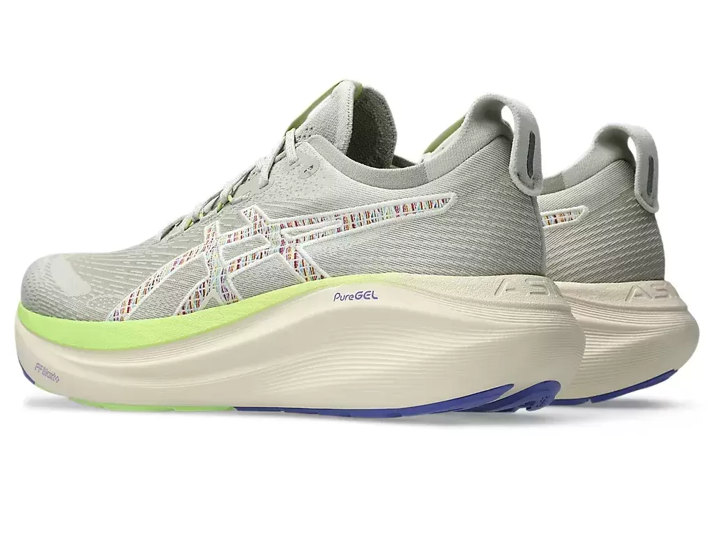 La suave amortiguación de las zapatillas GEL-NIMBUS® 27 NATURE BATHING™ TR te hace sentir como si aterrizaras en las nubes. Este diseño se ha renovado para crear una experiencia de carrera más suave y fluida. Su combinación de colores se inspira en elementos del paisaje costero tropical, como olas, madera flotante, rocas y conchas marinas.