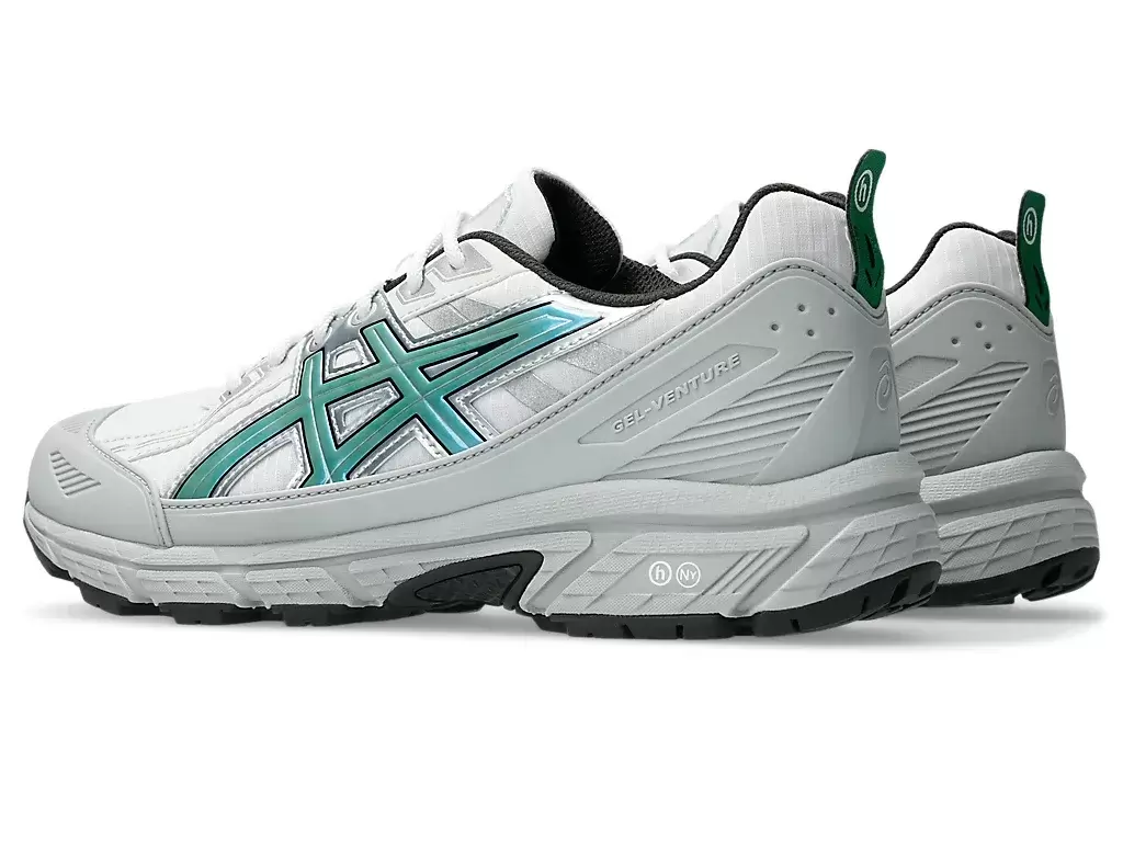 HIDDEN NY reinventa las zapatillas GEL-VENTURE™ 6 SHIELD con influencias de diseño provenientes de laboratorios de piedras preciosas y estudios arqueológicos realizados en el suroeste de Estados Unidos. La malla antidesgarro blanca contrasta con las rayas ASICS en turquesa metalizada, que emulan la joyería turquesa del suroeste. Detalles adicionales incluyen detalles reflectantes, cordones transparentes con extremos de silicona, el logotipo de HIDDEN NY y un mapa turquesa impreso en la plantilla. Además, la plantilla incorpora tecnología GEL™ en la parte trasera del pie y un patrón de tracción específico para senderos. Estos componentes trabajan en conjunto para proporcionar una absorción de impactos y un agarre superiores en diversas superficies.