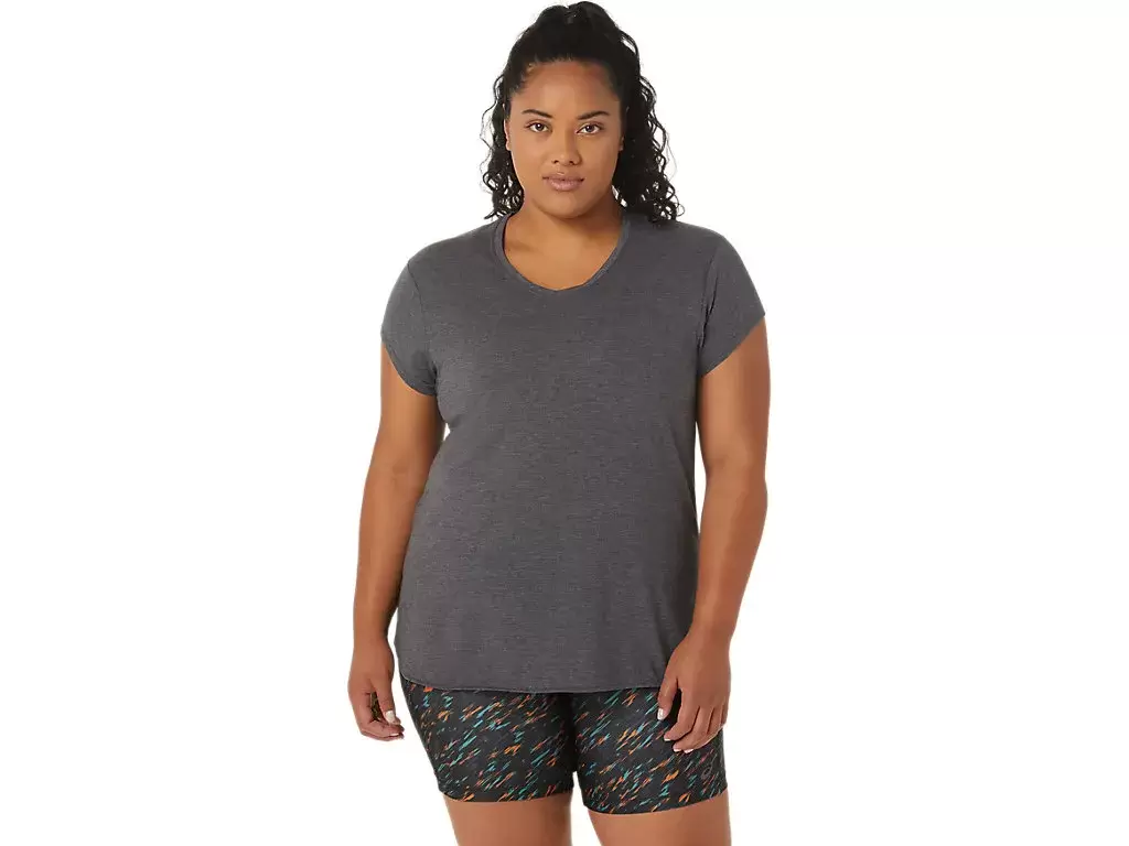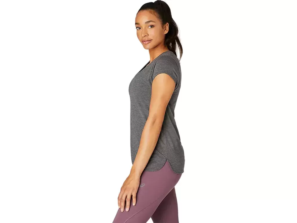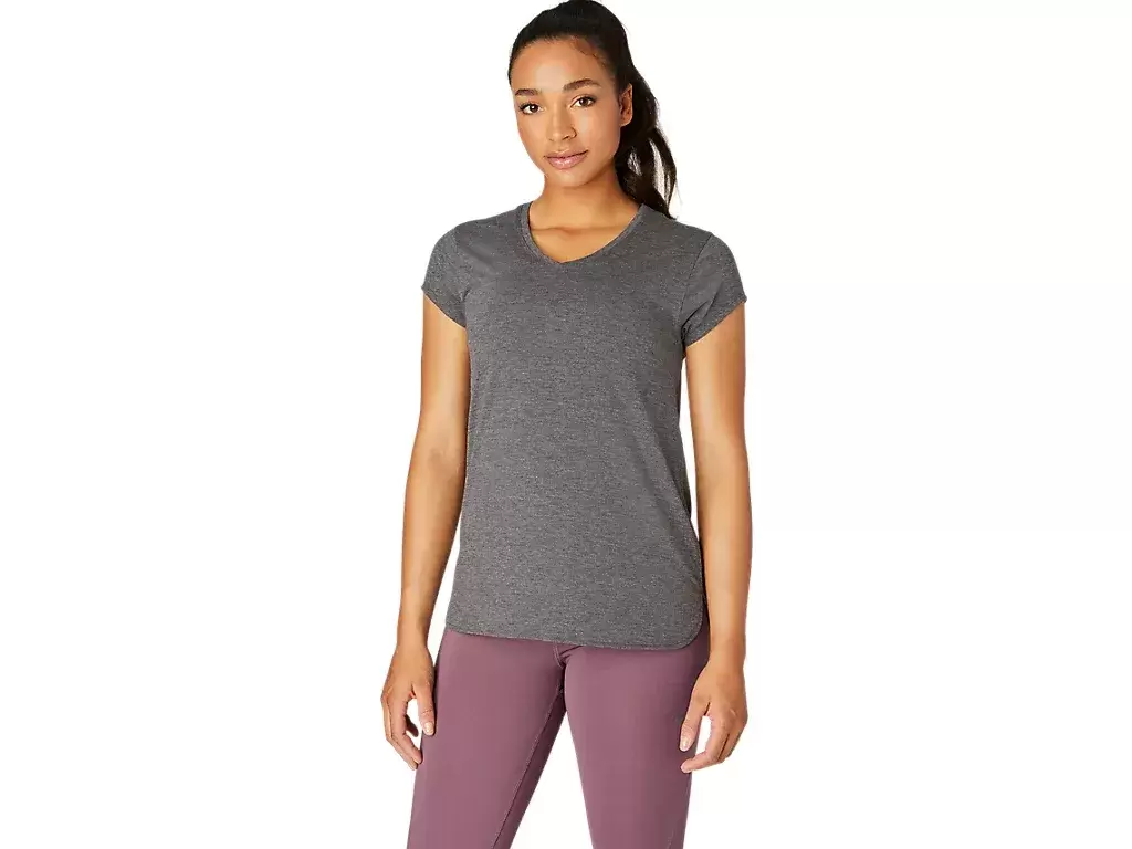 Esta camiseta de manga corta con cuello en V está diseñada para brindar una sensación elegante en contacto con la piel. Presenta un cómodo tejido de punto con costuras laterales delanteras para mayor libertad de movimiento.