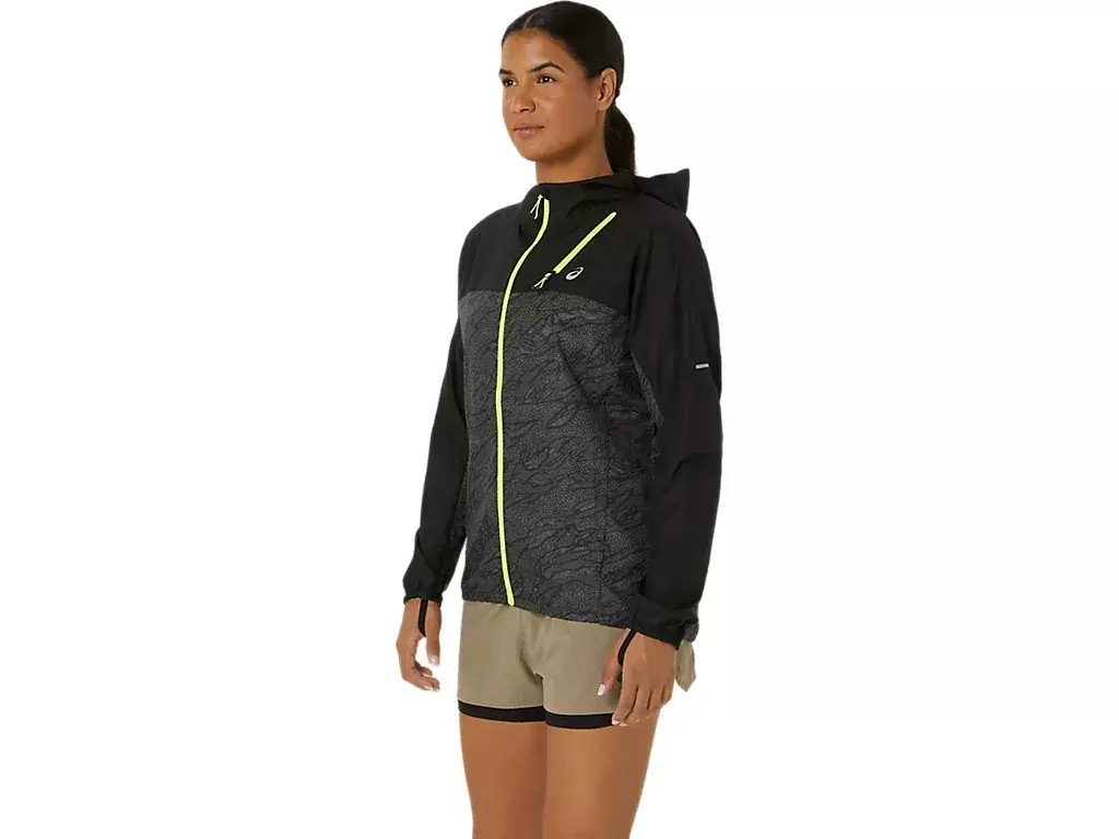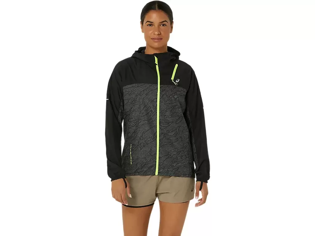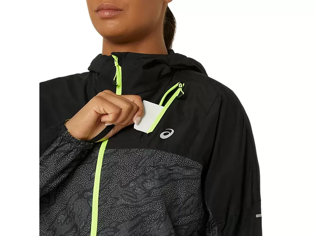 La chaqueta presenta un estampado integral y se puede quitar y guardar fácilmente en el bolsillo del pecho durante la carrera.