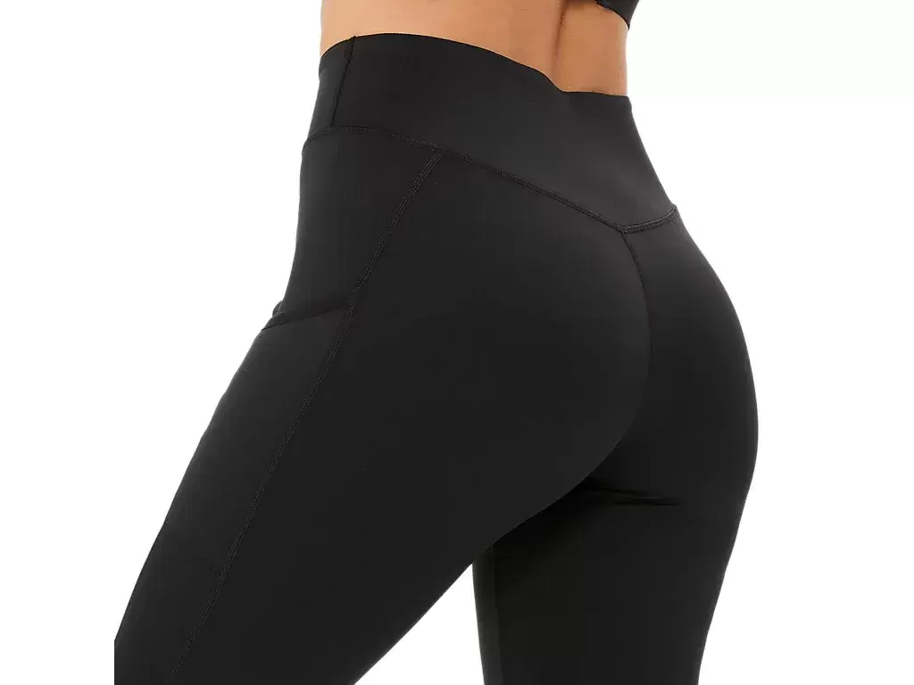 Las mallas están confeccionadas con un diseño de cintura con corte en V y cuentan con una banda elástica especial, delgada, plana y de cintura alta que proporciona estabilidad y transpirabilidad, y bolsillos laterales para guardar objetos esenciales más pequeños.